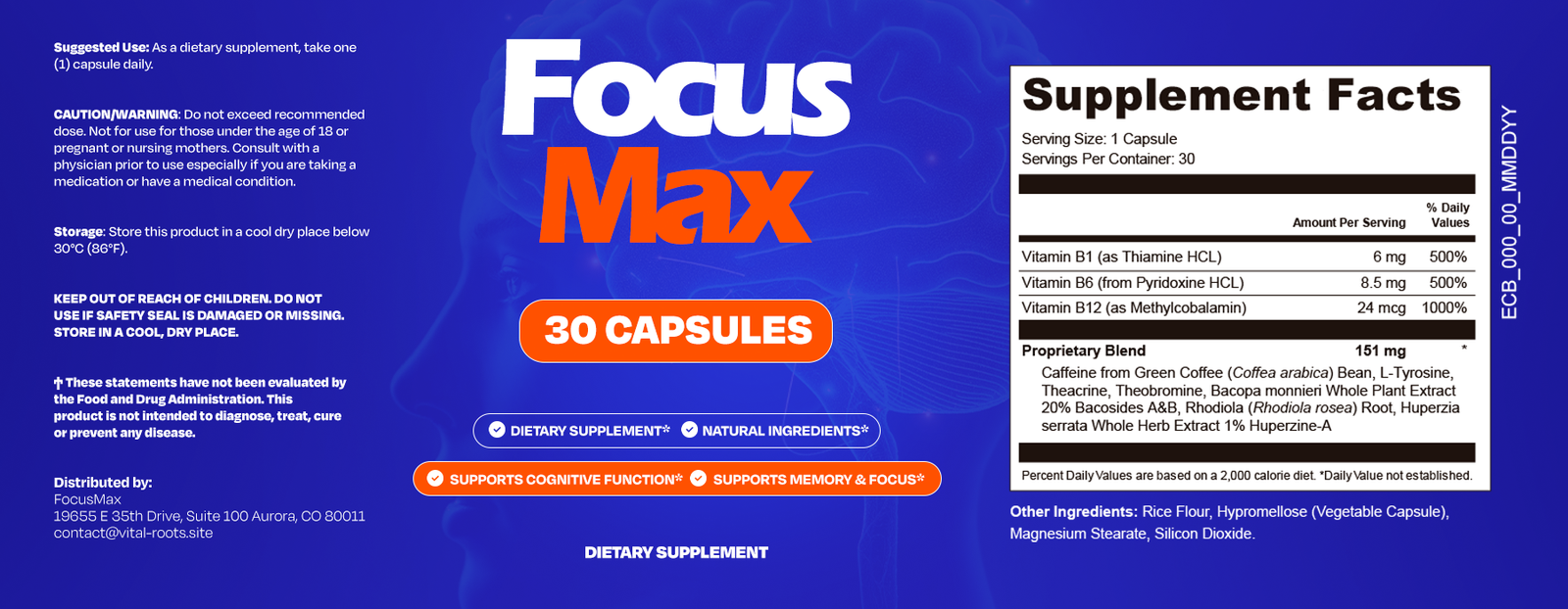 FocusMax™ is a dietary supplement formulated with essential B vitamins and a proprietary blend of natural compounds — designed to support cognitive function, memory, and daily focus.